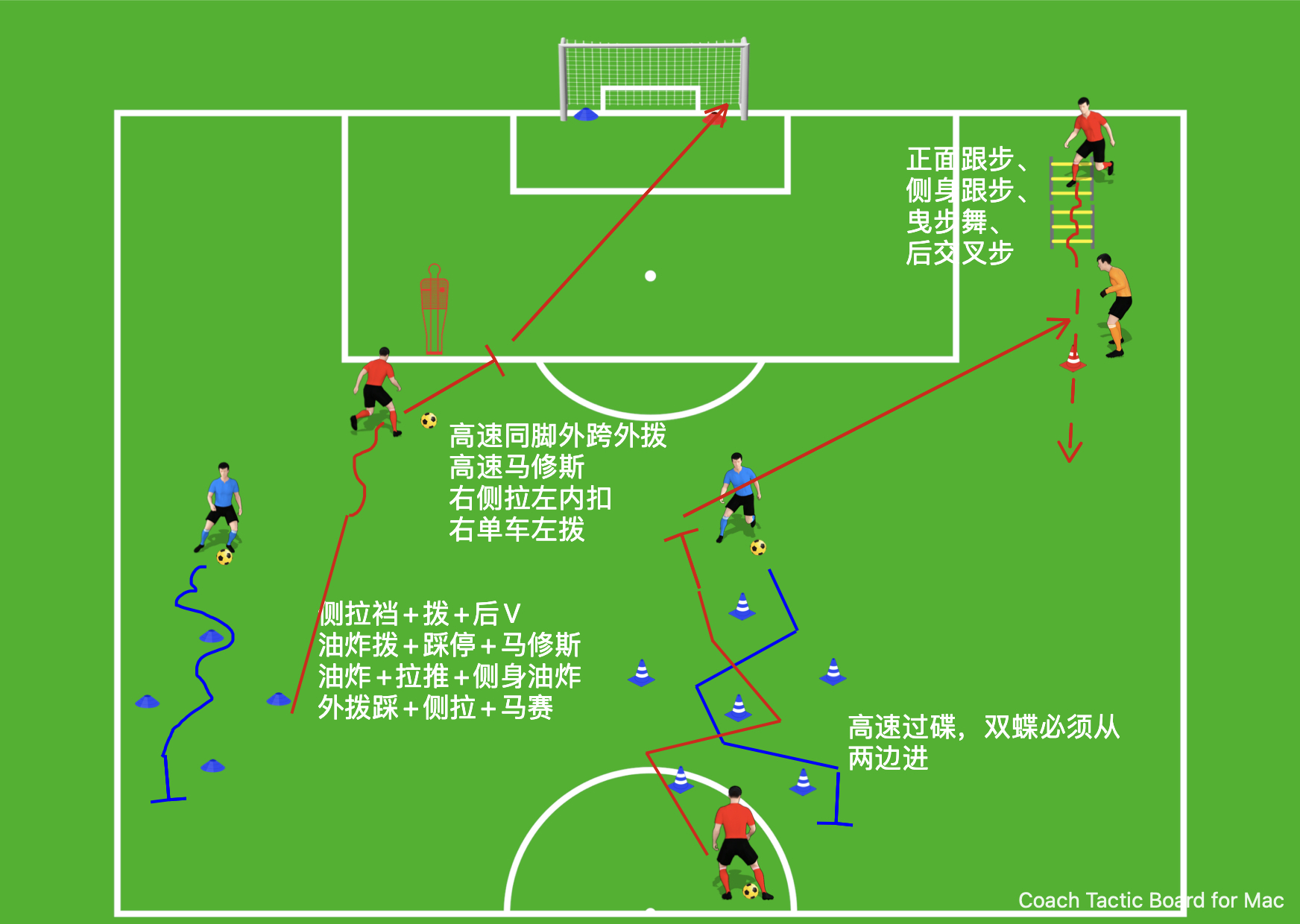 5.快速假动作后的内切射门:高速同脚外跨外拨、高速马修斯、右侧拉左内扣、右单车左拨
