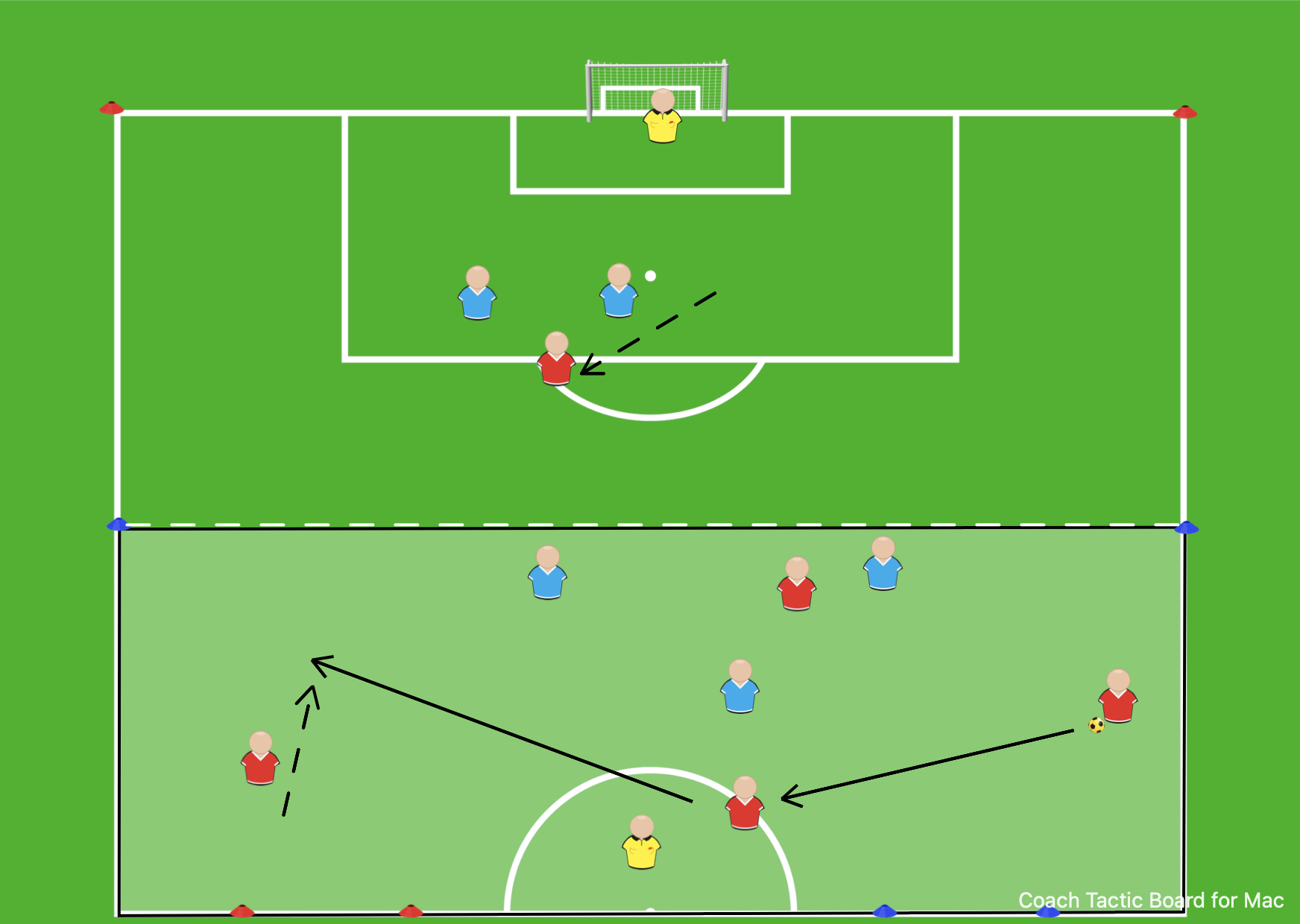 设一个标准球门并配备守门员,在中线上设置两个3米宽的小球门(与边线相距10米)。设置一条中线,将场地划分为前场和中场区域。训练时,在中场区域进行4名进攻队员对3名防守队员的对抗,在前场区域进行1名进攻队员对2名防守队员的对抗。进攻方从中场组织进攻,寻找将球传给前场前锋的机会,前锋得球后完成射门。球传给前锋后,前卫队员可以进入前场协助进攻。进攻结束后,由守门员发球给前锋重新开始练习;若防守方获得球权,则反击两个小球门。