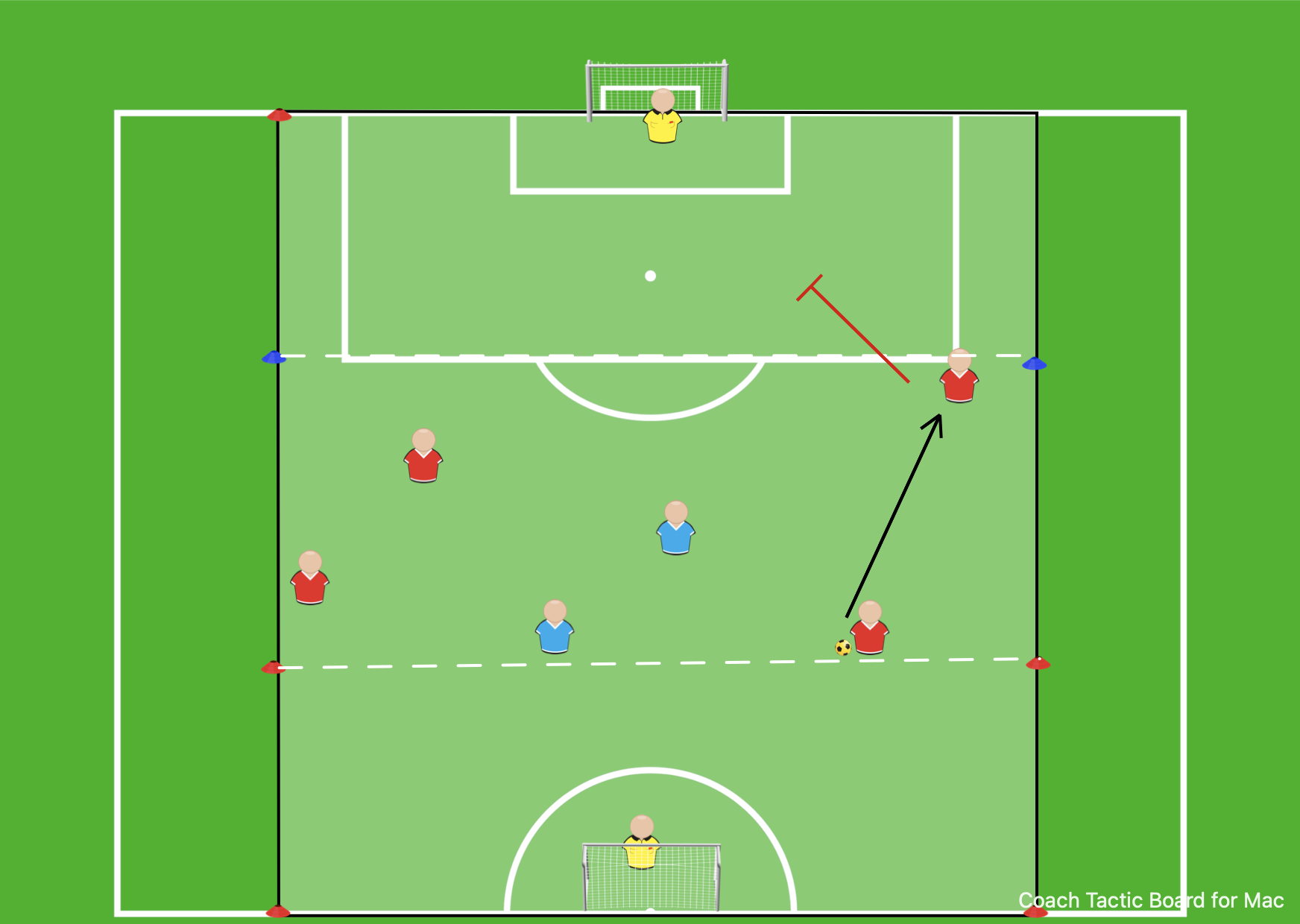 设置一个20米×30米的场地,两端各放置一个标准球门,每个球门配备一名守门员。将队员分为两组,每组4人。训练在场地内的两条线之间进行4对2对抗,传接5脚后,控球方队员可以过线突破,只有在运球过线后才可以射门。射门得分后,进攻方转向另一个球门继续进攻;若防守方或守门员获得球权,则两队交换攻防角色。